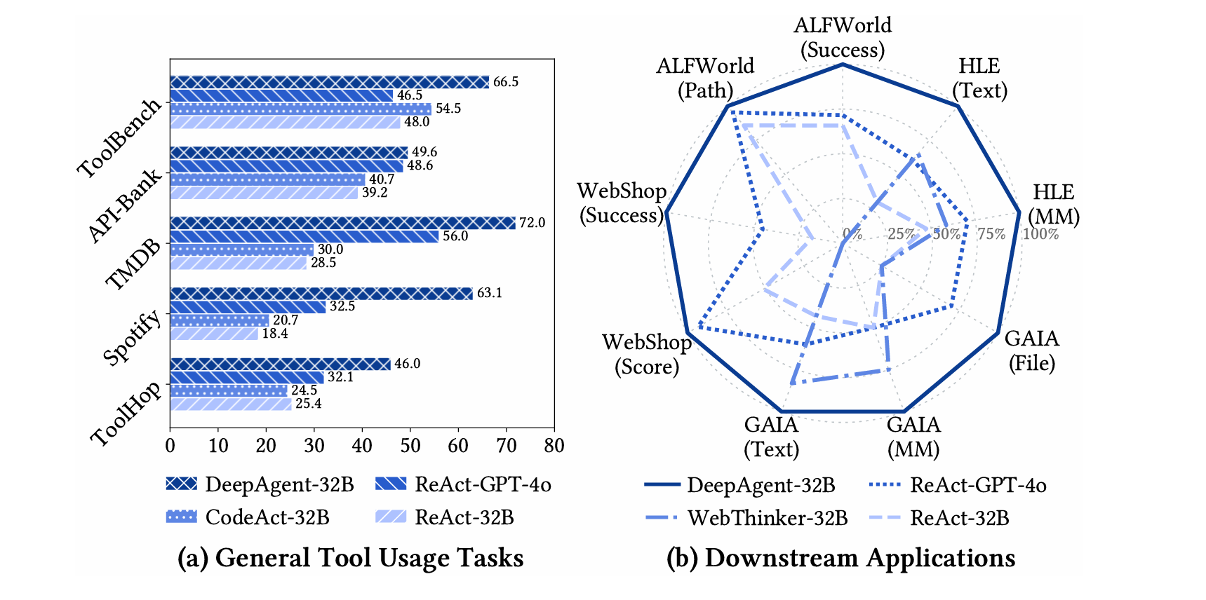 为应对上述挑战,我们提出了 DeepAgent,一个能够在单一连贯的推理过程中,动态检索和调用工具来完成整个任务的端到端深度推理智能体。