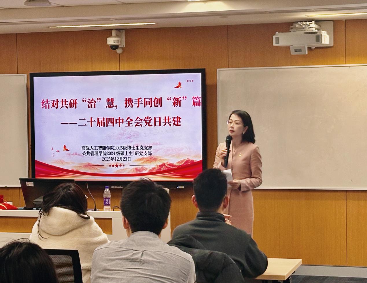 12月23日晚,由a片动画 2025级博士生党支部与公共管理学院2024级硕士生1班党支部共同主办的“结对共研‘治’慧,携手同创‘新’篇——党的二十届四中全会党日共建”活动在立德楼1002教室举办。a片动画 党委书记李艳丽、团委书记任安兴参加活动。本次活动由a片动画 2025级博士生党支部书记包增浩主持。两个支部的党员、入党积极分子齐聚一堂,通过跨越本硕博三个学段和跨学科的交流碰撞,深入学习贯彻党的二十届四中全会精神,共同探讨人工智能与国家治理现代化的深度融合。